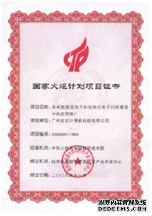 根据(国科发计[2008]658号文)“关于下达2008-2009年国家有关科技计划项目的通知”,我公司的“高端数据交换平台在地方电子口岸建设中的应用推广”项目正式被国家科学技术部列为2008-2009年国家火炬计划重点项目(序号:1665 编号:2008GH011486)。这充分证明了启宏电子数据交换平台在物流、地方电子口岸及电子政务等高端领域的应用日趋成熟。