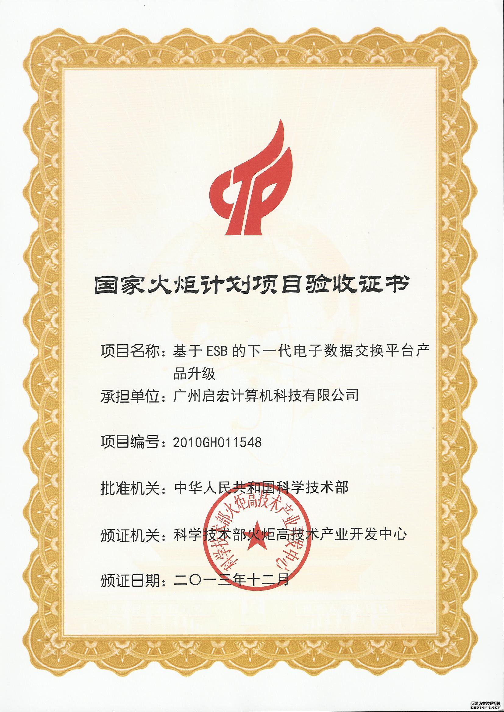 致力于智能数据处理与异构系统融合研究及在物流、电子商务、电子政务领域等大数据应用的广州启宏计算机科技有限公司,自主研发的基于ESB的下一代电子数据交换平台项目自2010年10月被认定为国家火炬计划重点项目后,通过启宏科技不懈努力,历时3载完成该产品应用升级,该项目于近日顺利通过国家火炬计划项目验收。