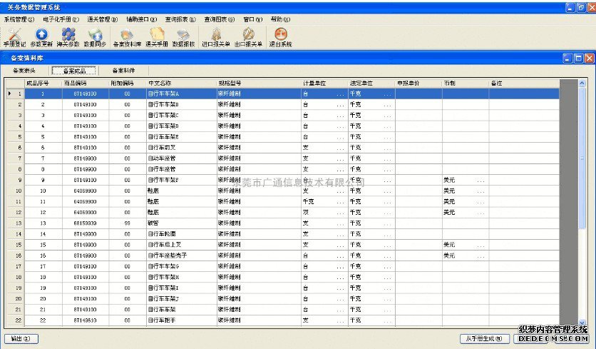 通关平台中的工厂商品包括两种表现方式的商品, 一种是企业原始物料,由企业的ERP或MRP软件中直接提取出的数据资料, 原始物料是未经过归并加工的企业生产物料, 包括企业生产所需的基本的物料-原始料件, 生产的成品以及料件相对于成品的耗量关系(BOM表)。 一种是企业申报商品,是在企业实际进出口操作时使用到的商品资料, 这种商品资料需要向海关申报备案,经过海关审核后, 企业通过报关单或清单通过海关口岸进行实际进出口操作, 这部分商品是企业根据海关的规定、按照一定的规则对企业的原始料件进行归并后相成的, 也就是一种归并后的申报商品对应多个企业原始物料商品,同时出口的成品对应耗量关系的料件也是经过归并的申报商品。